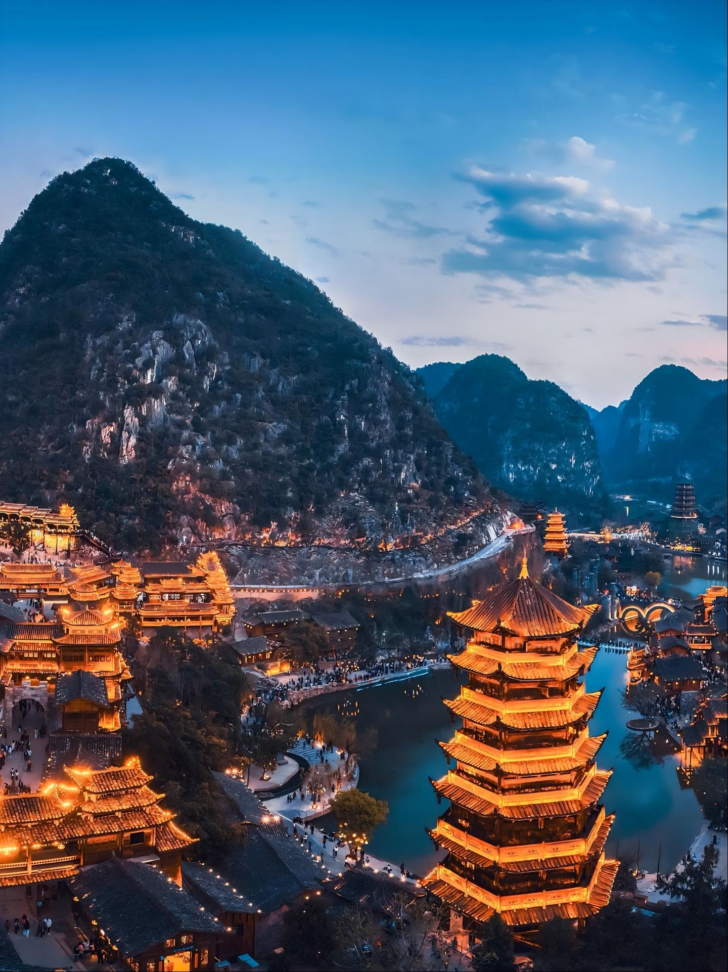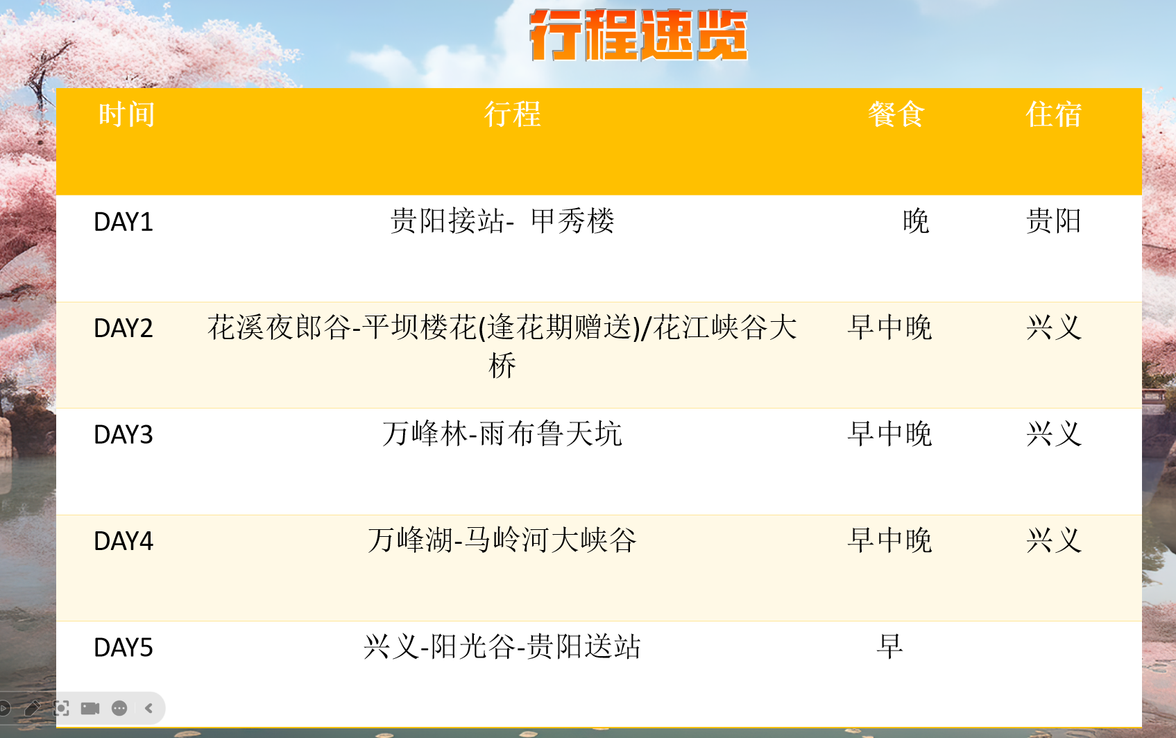 早餐后乘车约2小时抵达【夜郎谷】。在贵阳市花溪区的青山绿水间,隐藏着一处充满 魔幻色彩的艺术秘境——夜郎谷。这是贵州旅美艺术家宋培伦,怀揣着对古夜郎国的想象 与乡愁,历时近三十载,带领当地村民用双手在喀斯特地貌上垒砌出的“石头奇幻王国”。 之后我们乘车前往【平坝樱花】/【花江大峡谷】。【平坝樱花】位于贵州省贵安新区, 毗邻红枫湖,樱花林被湖泊分割成100多个独立小岛,形成“湖中有岛,岛上有花”的独特 景观。是全球规模最大、品种最全的连片樱花种植基地。樱花密度极高,从高空俯瞰如粉 色海洋。【花江大峡谷】我们会在云渡服务区欣赏峡谷全景 贵州花江峡谷大桥于 2025 年 9 月 28 日通车,主跨径 1420 米、垂直高度 625 米,是世界第一高桥。云海之上,天堑 通途,花江峡谷大桥,横跨在深邃的峡谷之上,云海在腰间流淌