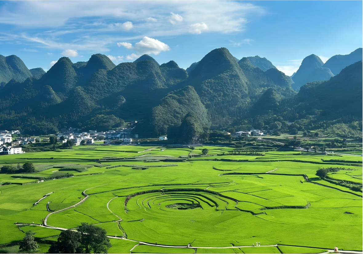 早餐后出发本次旅途第一站【万峰林】。总面积达2000多平方公里,是世界锥状喀斯 特峰林地貌发育最典型的区域。沿田园地块分为两边。一边是一条山腰的环山路,向下俯 瞰,村落点缀在峰林边稻田间,别有一番景致;另一边是可双向行车的田间村落道路,可 以低角度欣赏万峰林风光,同时近距离感受布依村落的风情。 600年隐世古村·雨补鲁天坑秘境 雨补鲁天坑,一个藏在兴义万峰林深处的600年古村落,曾是《爸爸去哪儿》取景地。这 里群山环抱,石屋错落,古树参天,最神奇的是村中央的巨型“地漏”——由页岩铺成放射 状,既是排水系统,也是绝佳拍照点。天坑底部良田百亩,山泉流淌,宛如现实版世外桃 源。